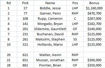 * I don’t have Walter’s bonus as I’m writing this, but my guess is somewhere between $350-550K. When you add that to the $650K from Musser and Pointer, you get somewhere between $1M and $1.2M. Add that to the $2.6M spent on the first 10 rounds, and you’re around $3.5M. We all want the Phillies to spend more. But the totals are a bit superficial. Teams with top 5 picks in the draft will spend a lot more money, because those guys taken in the top 5 to 10 will cost a lot more. The Phillies will have spent over $1M on bonuses after the first 20 rounds, which will likely put them in the top 15 among all teams. They chose to go with more college guys with upside coming off down years in the first 10 rounds, and then go with high school guys later. And they signed a bunch of the high school guys. So I like that.