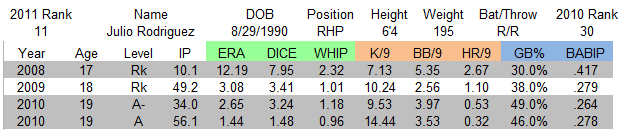 Strengths: Its tough to argue with the big strikeout numbers Rodriguez has put up. His long arms and legs help him create natural deception, and his arm works well in his delivery. Though the pitch is inconsistent, he can snap off a big breaking curveball that obviously confounds the inexperienced hitters in the NYPL and the SAL. He also improved his groundball and HR rate substantially in 2010, which is a positive sign.