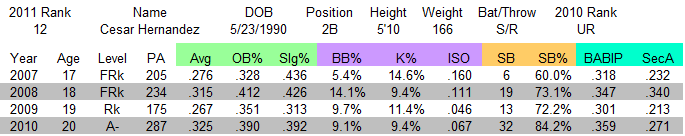Strengths: Hernandez does a number of things really well, starting with his ability to make consistent contact. He struck out in less than 10% of his plate appearances, which I consider to be elite level contact ability. By comparison, the strikeout rate of all prospects in the NYPL was 20.1% in 2010. On top of his ability to make consistent contact, he also walked in almost 10% of his plate appearances. He showed strong aptitude on the bases, and in a full season league, he figures to steal close to 50 bases. His defense should be an asset going forward.