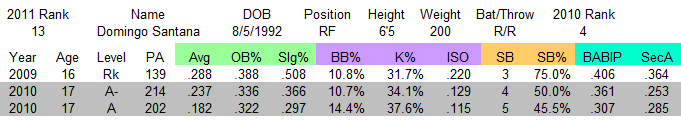 Weaknesses: Santana is mostly still projection. He was really in over his head in 2010, and if he’d spent an entire season at Williamsport, things might have looked different. He has major issues making contact, striking out in over 35% of his plate appearances, and he loses his timing with his swing. His raw power did not translate against better pitching.