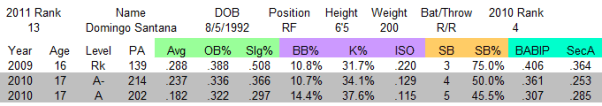 Strengths: Santana’s strengths are still his strengths. He’s a big dude, at 6’5/200, and he just turned 18 in August. He showed excellent raw power in 2009, in a league that stifles power, it just didn’t come out against more advanced pitching in 2010. His approach at the plate is advanced for his age, as he draws plenty of walks. He has a strong arm, and he should be an asset defensively in right field going forward.