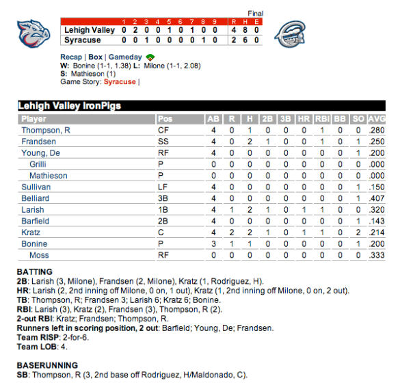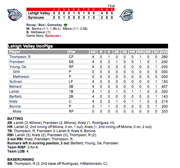 LHV, Reading, and Clearwater all have a share of first place this morning. I know it’s early and winning doesn’t matter, but for an IronPigs guy like me, I’ll take whatever I can get.
