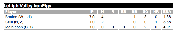 RHP – Scott Mathison (Lehigh valley) –(4.93 – 1 SV) 1 IP, 0 H, 0 R, 0 BB and 2 K’s (save)