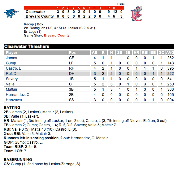 6. C – Sebastian Valle (Clearwater) – (.250) 3 for 5 with a 3B (1), 2 runs, 3 RBI and a K