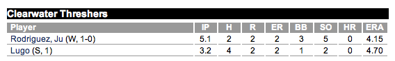 11. RHP – Julio Rodriquez (Clearwater)- (1-0, 4.15) 5.1 IP, 2 H, 2 R, 2 ER, 3 BB and 5 K’s (win)