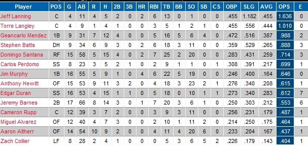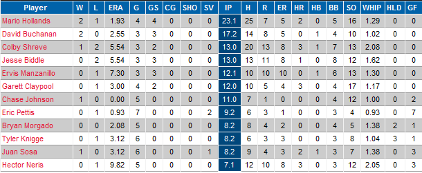 This isn’t a pretty picture. At all. Domingo Santana is hitting for a bit of power, but striking out at an alarming pace, even by his standards. Cameron Rupp, a guy I was really high on this season, has gotten off to a slow start. I’ve gotten very good reports on his defense, so I’m not too worried, but still, it would be nice to see him hit a bit. Aaron Altherr and Zach Collier have been brutal. Its early days, so we won’t panic yet, and 50 AB isn’t really enough to confirm any sort of hypothesis. But its not pretty.