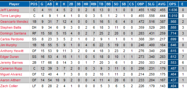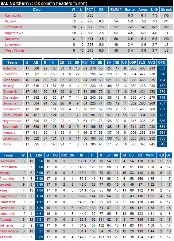Hey all. As I mentioned when the season was kicking off, I’m going to come off the bench and write the Lakewood report this year. I’ve been waiting to try and accumulate some data to look at, and going forward I anticipate doing this every week or every other week, not sure what day of the week, but that’s a minor detail. I’m going to give a statistical overview, and then some thoughts on the squad and pass along any tidbits I can find. So far, I haven’t done much digging on our guys there, simply because its only been a few weeks. But I hope to have more on that as the season progresses. So, let’s get after it.