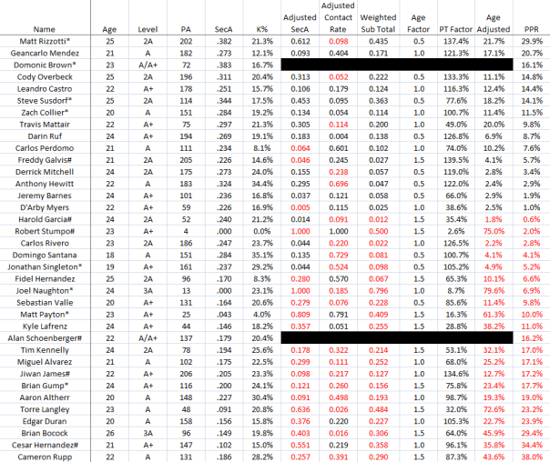 Edit, I forgot the formula! Each category (SecA, K%, K/9, BB/9, HR/9) is calculated based on the league average. So, if the player is in AAA, its his numbers against the league average for all players in the International League. The same applies to all leagues. The hitter’s performance, after adjusted relative to the league average, is adjusted based on age, and then finally the playing time adjustment is made. Playing time adjustment is based on a 100% scale. If the baseline is 150 PA, and the hitter has exactly 150 PA, then his playing time adjustment is 100%. If the player has more than 150 PA, his PT adjustment will be greater than 100%, if he has less, it will be less than 100%. This is to keep it a positive number. For pitchers, the weighted sub-total against the league average is multiplied by playing time and age adjustments.