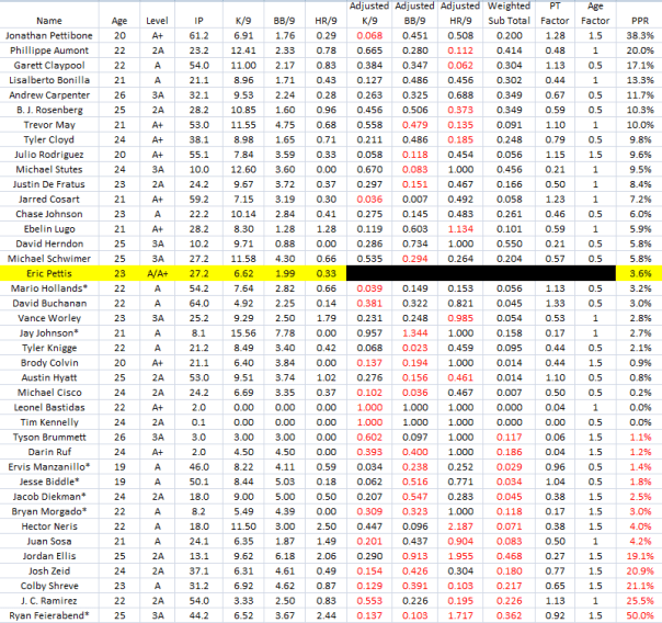 Biddle is young for Lakewood (19) so he will get an age boost. His peripherals are negative (-3.4%), so instead of his multiplier being 1.5 (a boost for a prospect with positive peripherals) it’s only 0.5