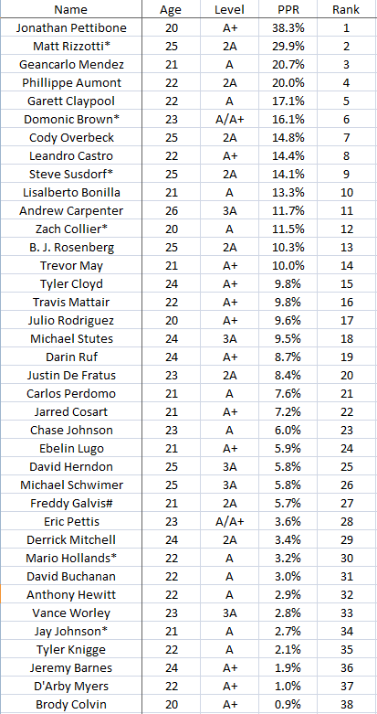 I made very simple cutoffs in terms of who to include. The following minor leaguers were omitted from the results