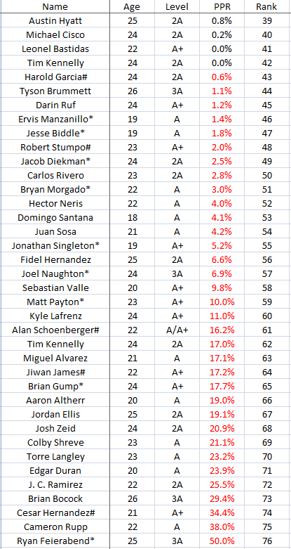 I don’t know quite what I think of PP’s new system for rating how pitchers are doing, but the more I think of it, the less I like it for hitters. Part of my problem is that the sabremetricians have been telling us that strikeouts don’t matter for hitters, yet Ks are one of the two metrics used to calculate the raw performance score for hitters. I also think the 1 – 1 setoff of steals and CS in the SecA overvalues steals. Sabremetricians have looked at this and tell us that a 1 -2.5 or so is a better offset. Finally, I think for a good all-around raw performance stat for hitters, that OPS works just fine. Admittedly it’s not league or park adjusted, but PP’s measure isn’t park adjusted either. If I had my druther’s, I’d go with a simple arithmetic age adjustment to OPS to get my corrected. I don’t see a need to correct for PA, that just favors leadoff hitters. If we have a small sample size issue for anyone, I just exclude them. I’ll take the average of PP’s appropriate age range for each level and add 25 OPS points for each year younger than that average and subtract 25 OPS points for each year over the average.