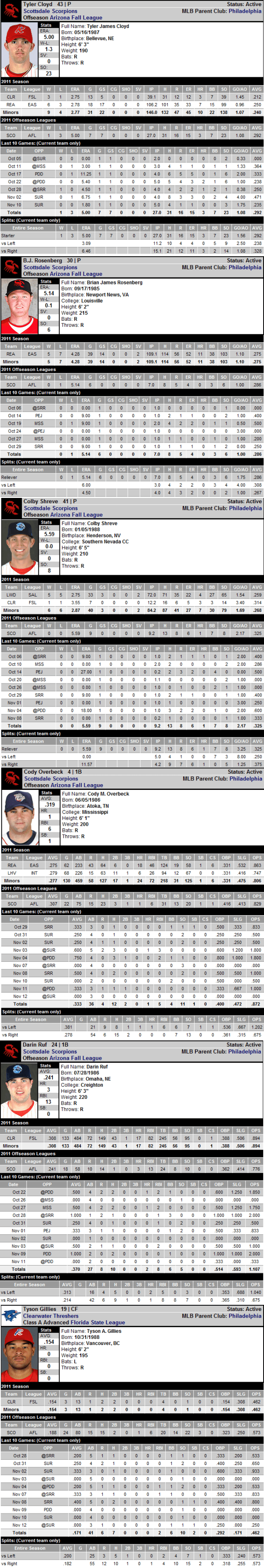 The runs/game average of the AFL so far is 6.07. League ERA is 5.45. In that context, Cloyd’s 5.00 ERA is nothing to sneeze at, Back of envelope math here, if you neutralized that to the context of the 2011 NL you’d have about a 3.51 ERA. Consider that with Cloyd’s peripherals, and he is really performing quite well.