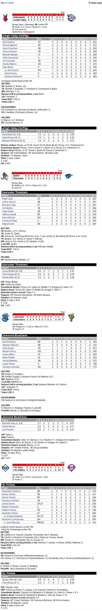 First things first, Biddle pitched great last night. A solo homer in the 6th to break his shutout withg no walks. That is so encouraging. Asche continues to hit and look great. He has a nice compact lefty swing, simlar to Pointer. Its also good to hear Slasher say his defense has been good too. He was a 4th round pick I believe so its not like he came out of the blue. I could easily see him in Reading after the all star break if he keeps this up, especially since they don’t have a third base prospect there. Alonso looks great too and if he keeps hitting, again, he will open some eyes. I don’t think he can play SS at the major league level, even in a utility role, but being able to play 2B, 3B, and LF gets you a look too, especially when you hit over 300. Knigge continues to get outs and looks like he should move up a level at the break also. The Lakewood pitching staff has been so bad as a whole and the hitting, with all those talent kids, so inconsistent, its probably been a very tough season for Morandini so far. I was hoping Giles would pick it up but not so far…