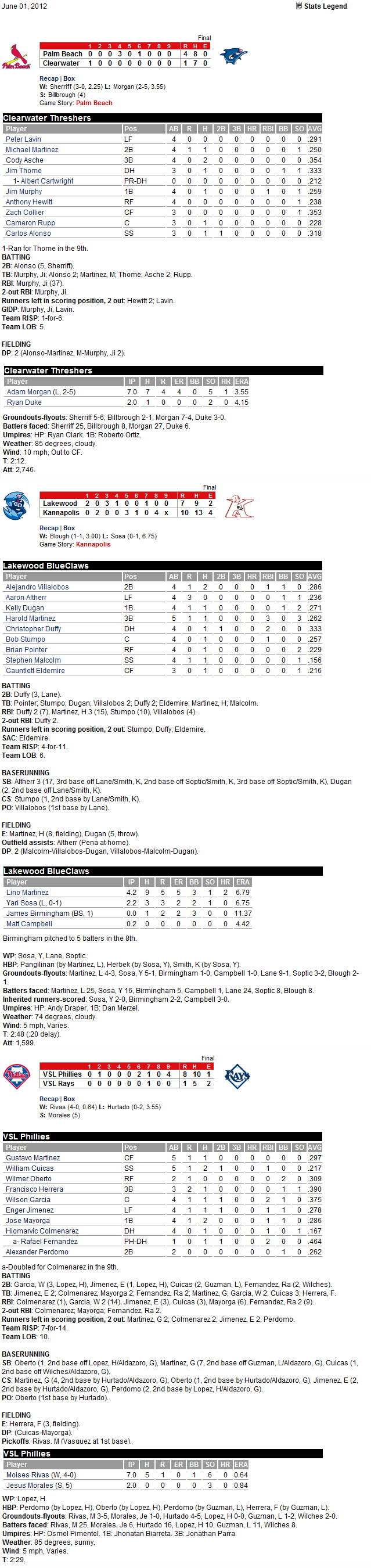 I was interested to see Michael Martinez at 2nd base. He played mostly 2nd in the Nationals organization, but I thought the Phillies like him as a shortstop, or at least as a utility infielder who can play shortstop well. When his rehab stint is over, I’d like to see him settle in at Lehigh Valley as their SS until the end of the season.
