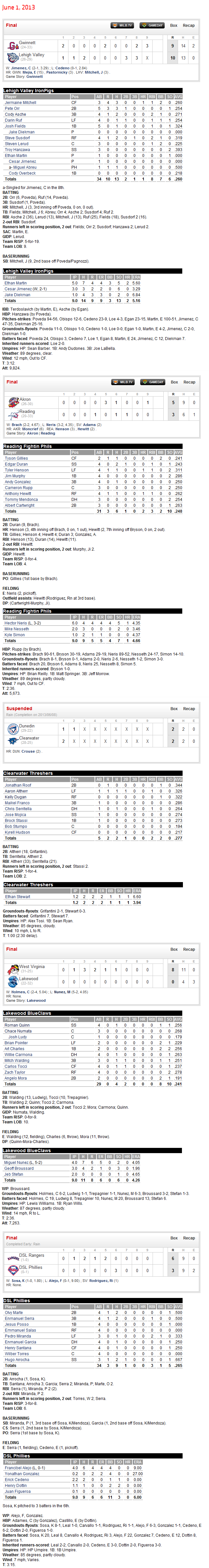June 1 and DSL starts up. None of thier starting nine are jumping out as big bonus guys. Anyone remember any of those names? Jermaine Mitchell seems to have been the catalyst for a 10-9 Lehigh Valley vistory, as he was 3-3 with a HR, 2 BB and scored 4 runs. Anthony Hewitt went deep for Reading.
