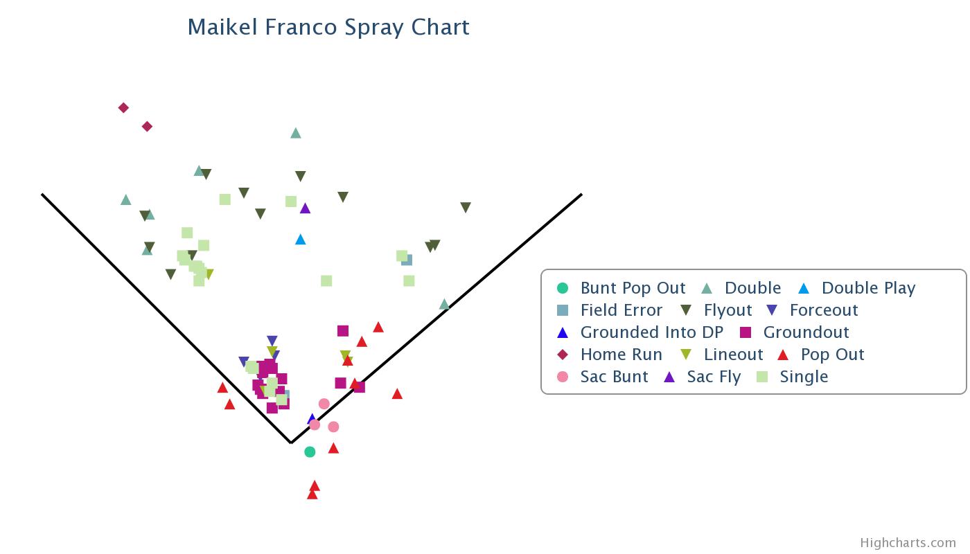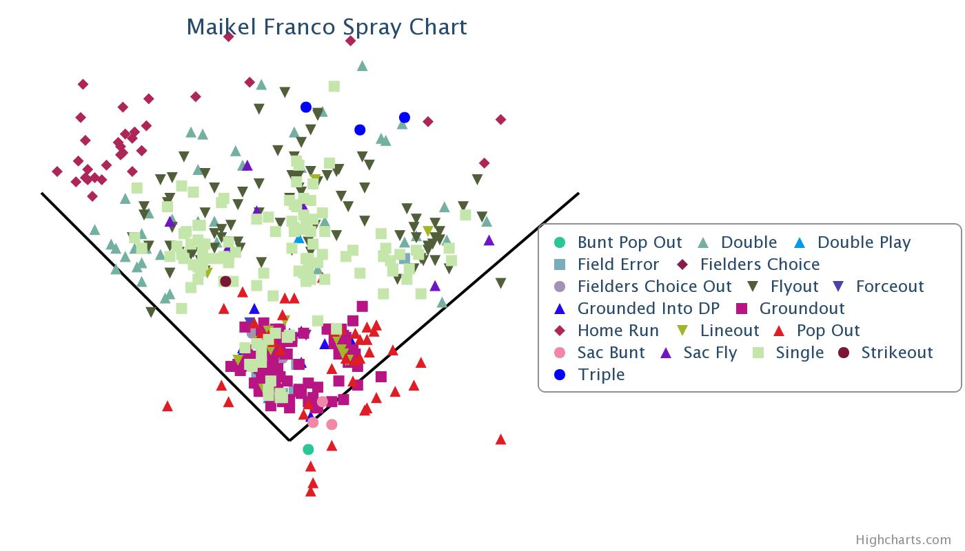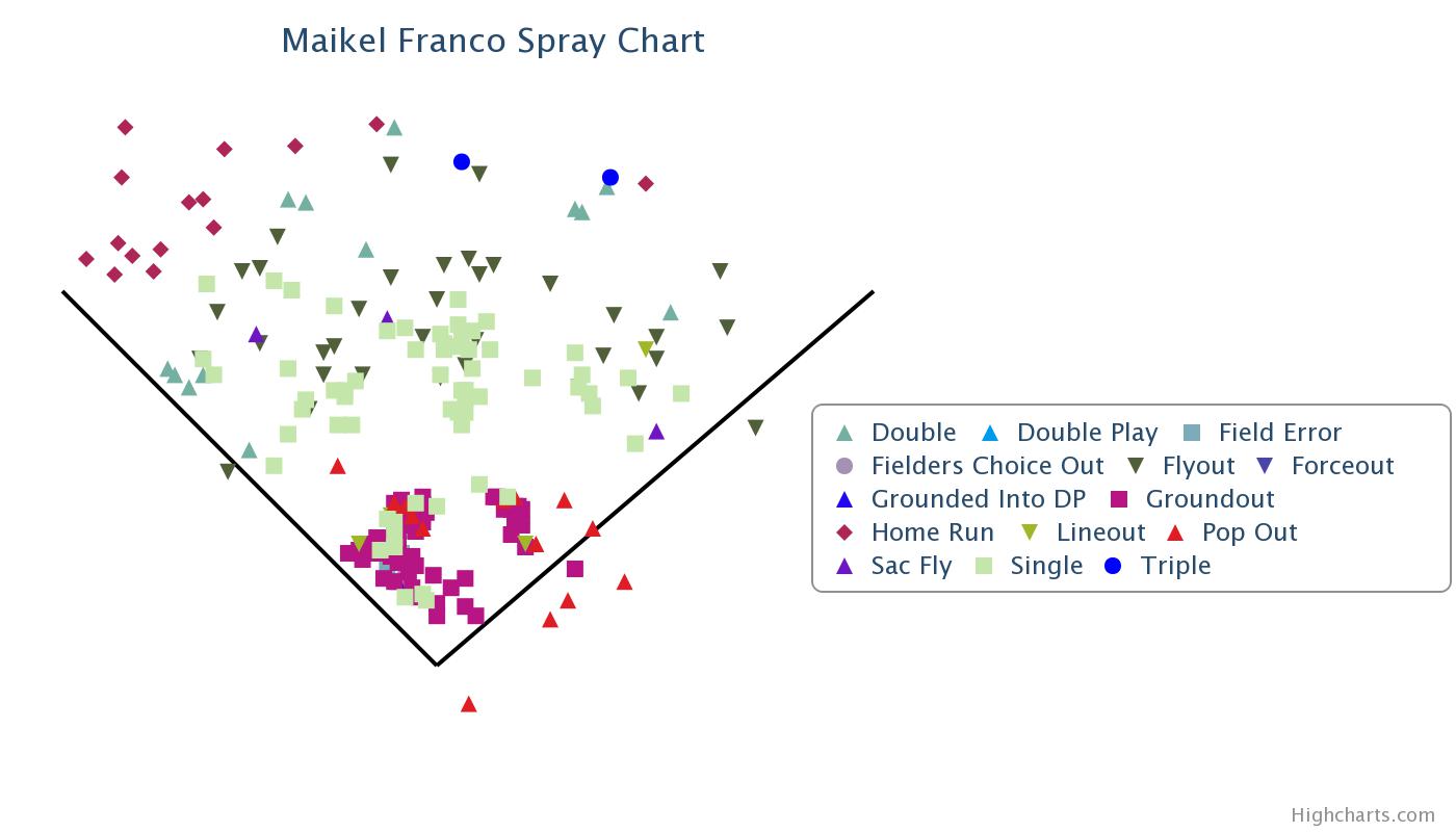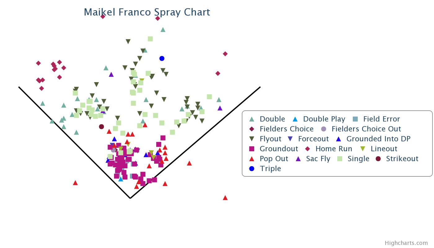 Here we have Franco going all over the field. He is driving the ball deep to the OF and taking advantage of the friendly conditions for HRs down the lines. There is still a strong ground ball pull tendency but there are some ground balls going the other way as well.