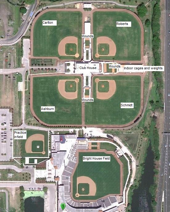 Spring Training 2014 began officially this morning when the pitchers and catchers exited their locker room in Bright House Field and entered the outfield in Schmidt Field for calisthenics. For those of you who haven’t been to the Carpenter Complex, I have attaced an overhead shot of the area below.