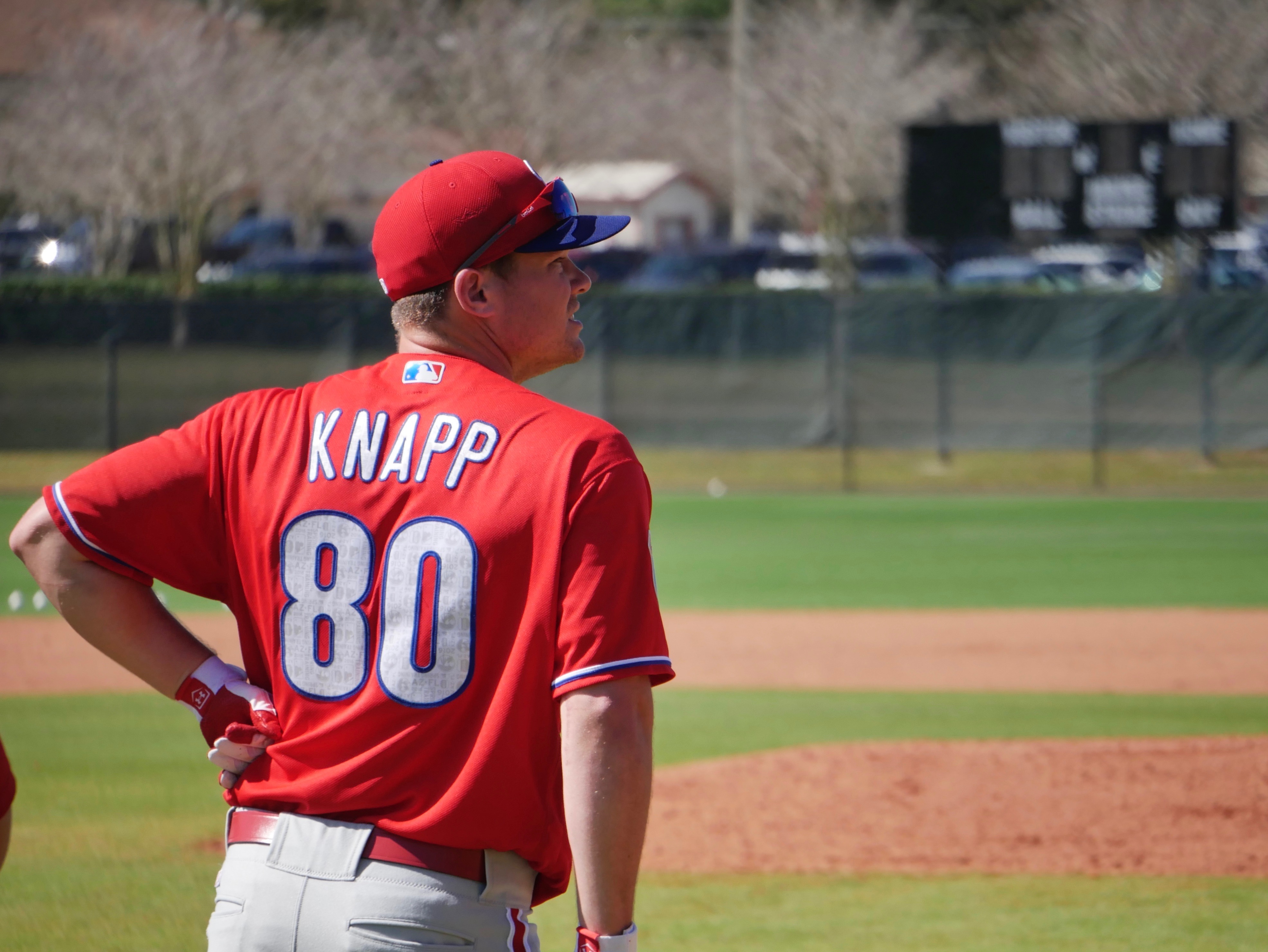 The nastiest drill has been a pop up drill for the catchers.  Saturday poor Carlos Ruiz, Cameron Rupp, Jorge Alfaro, J.P. Arencibia, Andrew Knapp, Logan Moore, and Gabriel Lino had to look directly up into an overhead sun against a cloudless blue sky to catch balls shot into the air by the pitching machine.