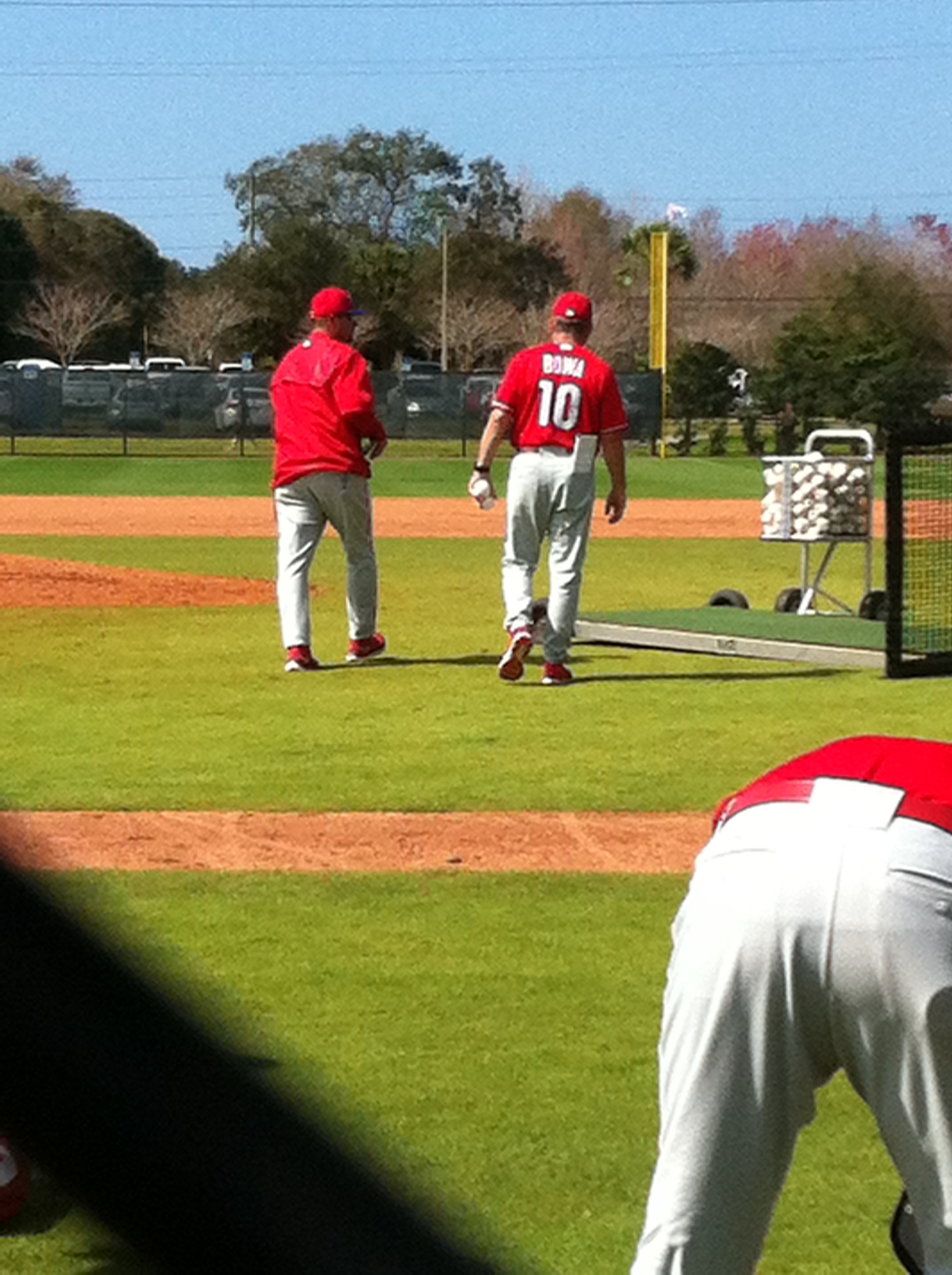Back to Tuesday. The fielders and catchers separated into groups for PFPs. The group distinctions seemed clear. The group on Ashburn Field included Ruiz, Rupp, Arencibia, Knapp, Howard, Franco, Hernandez, Galvis, and Crawford. The other guys went to Schmidt Field.
