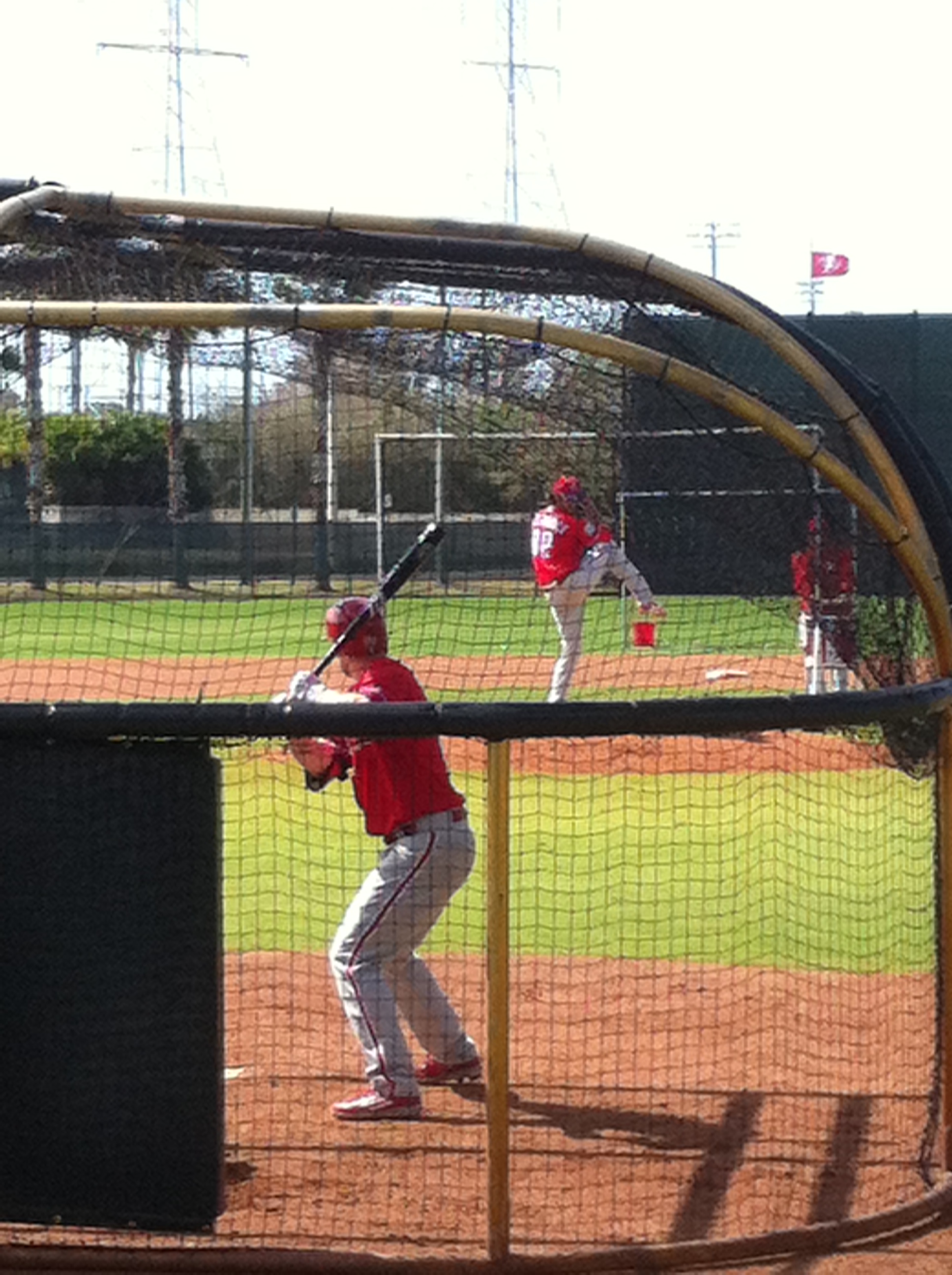 I watched the Howard, Herrera, Franco group bat against Edubray Ramos and Larry Bowa. Ramos was throwing some heat and spun Herrera out of the box with a pitch up and in. All three hitters looked good today. Howard stroked most of his contact to left and left center. Franco muscled a lot of pitches that were beat down at the fence by a strong wind. Herrera just keeps hitting line drives. He put a few balls over the right field fence. I’m glad I don’t park there anymore.