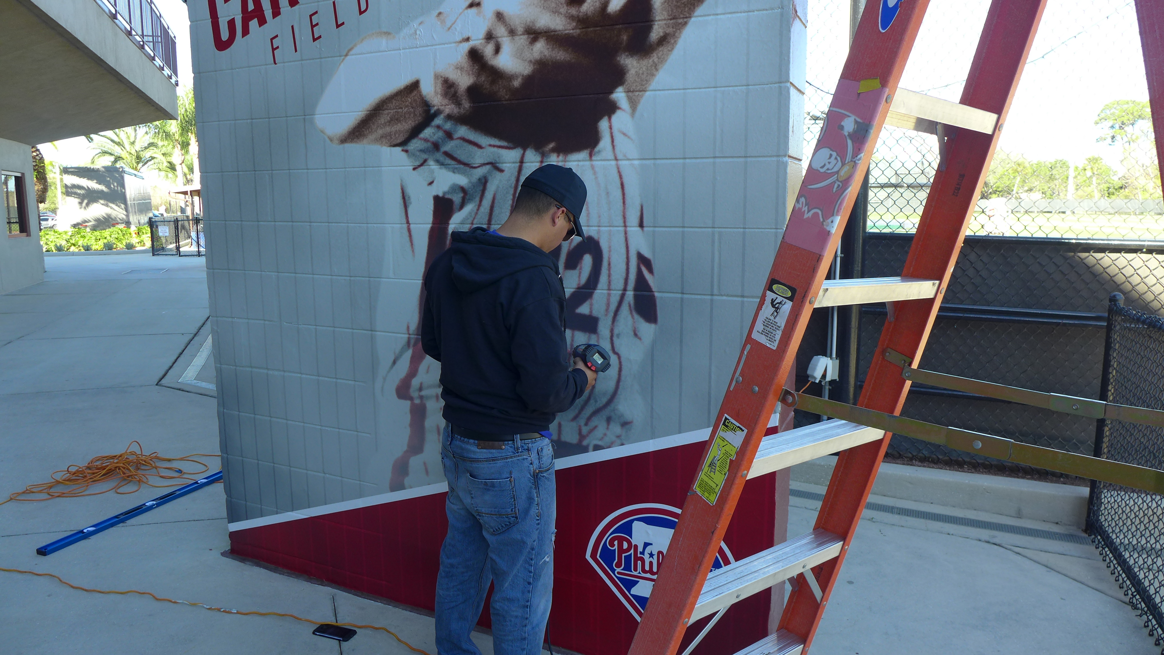 The pictures were installed by Outdoor American Imaging.  They have a peel off back that holds the picture against the wall, then they use a heat gun to insure the picture adhere’s to the wall.  In the photo below, you can see the mortar lines after the heat gun is applied. You can also see the untreated section in the lower right (about waist high).  That’s the heat gun not a radar gun in his hand.heat-gun-on-mural