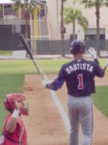 When Bautista came out to bat the next inning, he walked over to the guys by the fence and chatted with them during warm ups. Again, the players cheered every pitch as Marcelino got ahead. At 3-2, Bautista fouled off a couple pitches before lifting a soft fly to left center. The fielder tried for a diving catch and the ball popped out of his glove. Bautista motored into second to applause. Bautista also playfully poked a young fan through the fence with his bat on several occasions. I had heard that he was a dour personality. He seemed very fan friendly today.