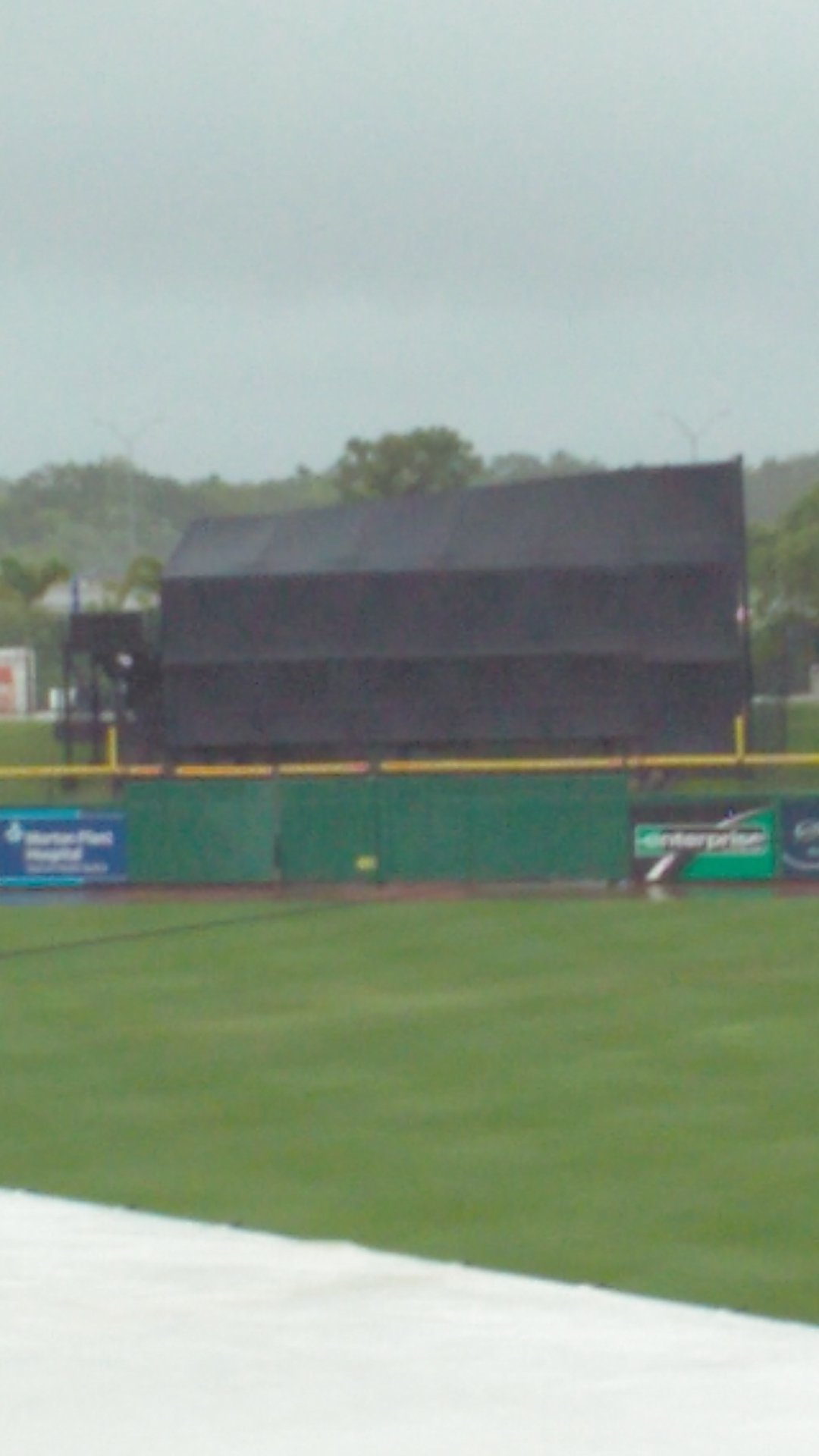 Sunday’s game was rained out. I was on hand at noon for the Sunday brunch. The only indication that the game was in doubt was the tarp on the infield. Around 12:50, the skies opened and the wind blew. Oh how it blew. Note the damage to the batter’s eye.