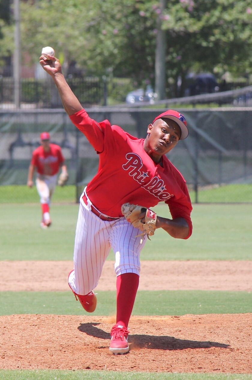 The 19-year-old RHP has a seriously big arm. Pina arrived at the Carpenter Complex to little fan fare for 2019 extended spring training. He was under the radar, just another name on the back of a jersey … until his first appearance. The Complex pretty much came to a halt. Everyone stopped what they were doing to come over to Ashburn Field to watch Pina pitch. Many pitchers clamored to learn the 97-mph velocity of his first pitch.