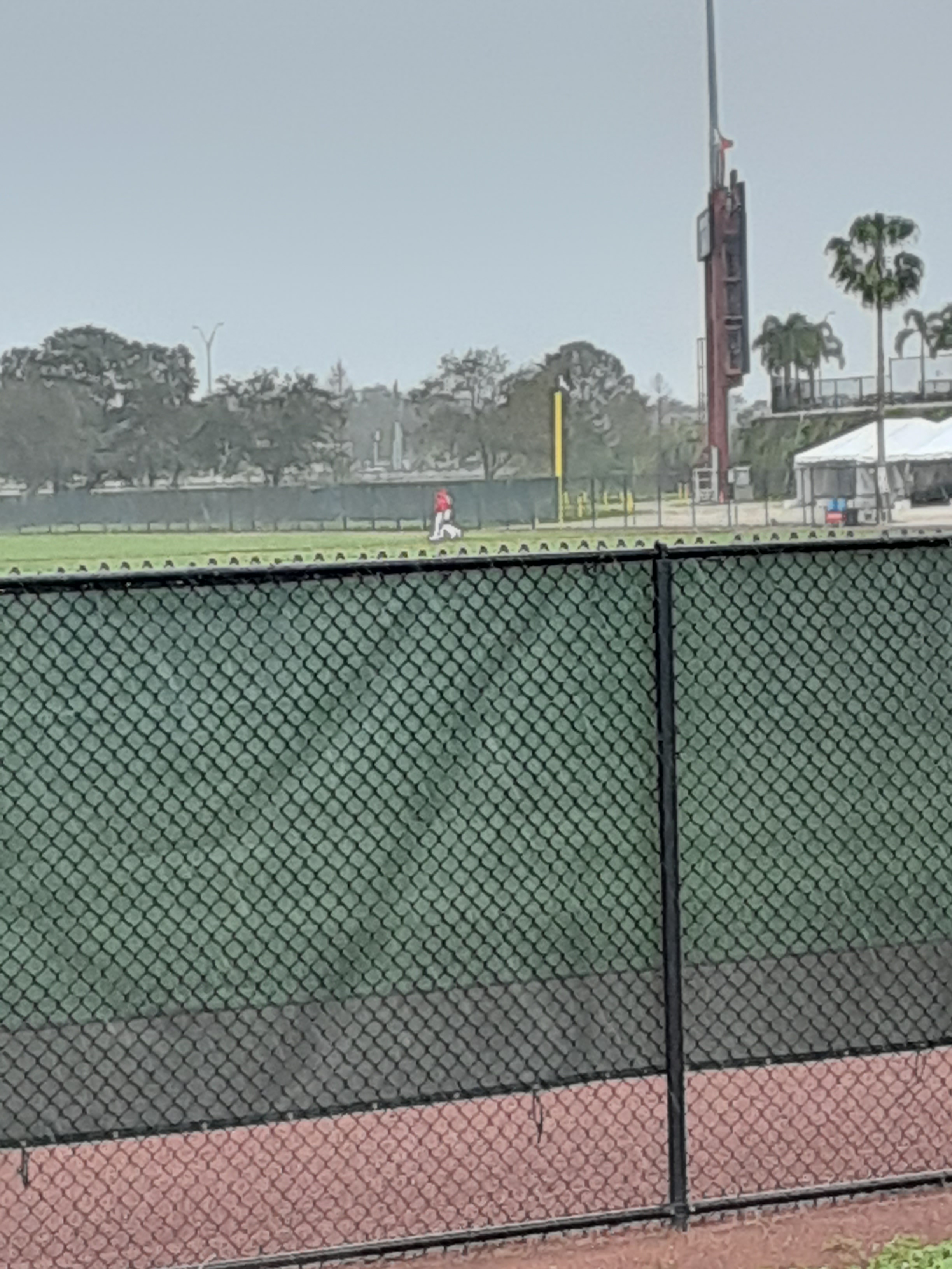 A little after 10:30 AM, players started trickling out in groups of two or three.  Steve, mutual friend and photographer Mark Wylie, and I took up our positions along the driveway where we are allowed to watch. The players mingled over on Schmidt Field before pairing up and throwing.  They started with soft toss and expanded to long toss although not far as I’ve seen in the past.  No sense risking an arm in this weather.