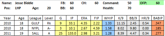 2011 In Review: Biddle was sent to Lakewood despite not pitching as much as a typical high school pick the year before, and responded with a very good showing after a rough first month. His strikeout and walk rates both improved after the break, and over July/August he pitched 54 innings, striking out 50 and walking 28.