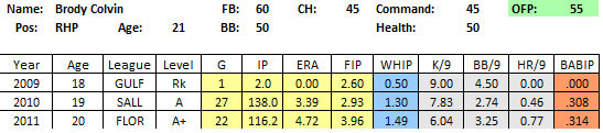 2011 In Review: 2011 was a year that Mr. Colvin would like to forget. And the best thing about baseball is, he can do just that with a fresh start in 2012. He suffered from bouts of wildness and inconsistency, as well as injury, in what was a troubling season overall.