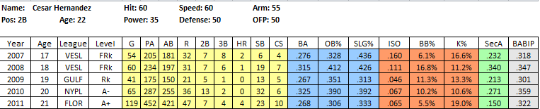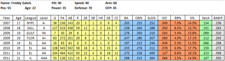 Risks: As mentioned, Galvis really doesn’t possess any secondary skills at the plate, evident in his .213 SecA at AA and .107 SecA at AAA. Galvis is still just 22, so if he can build on his 2011 gains, he might still improve a bit at the plate. The key will be to not lose a step in the field, as his glove will carry him.
