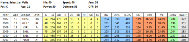 2011 In Review: Valle posted his best batting average of his pro career in 2011 in the pitcher-friendly Florida State League. Additionally, he saw his K rate rise only slightly, despite playing at a higher level and being one of the younger regulars in the league. At one point considered a bat first catcher who might not stick at the position, he backed up his 33% CS rate in 2010 with a 32% rate in 2011.