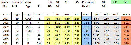 2011 In Review: After conquering two levels in 2010, De Fratus conquered the two top levels of the minors in 2011, striking out 99 and walking just 25 in 75 IP. He again showed excellent control and quality command, allowing only 4 HR while generating a lot more groundballs than flyballs.