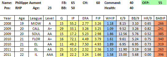 Risks: As mentioned above, Aumont is really tall and has a lot of moving parts in his delivery. He gets good extension toward the plate, which adds explosion to his fastball, but it makes it tough for him to repeat. He will have to limit the walks if he wants to pitch at the end of games, though his 3.19 BB/9 rate in AA was solid progress before spiking back up in AAA. He’s had health issues in the past and needs to stay 100% healthy in 2012 to alleviate some of those fears.