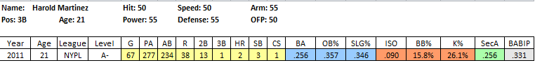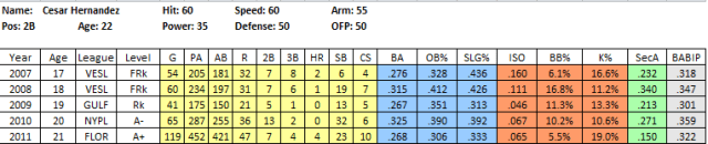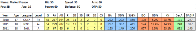 2011 In Review: As one of the youngest regulars in the pitcher-friendly, college-centric New York Penn League, Franco more than held his own. He hit .287/.367/.411 in 229 PA, with 20 extra base hits and an above average 12.4% BB rate. More importantly, he struck out in just 15% of his at bats.