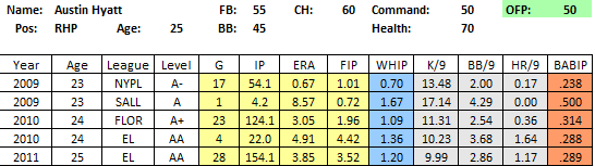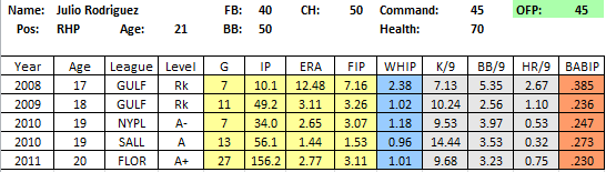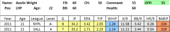 Risks: The biggest red flag is the overall lack of strikeouts. He struck out only 6.43/9 in 2011, though this was a gain from his 2010 mark of 5.77. Without a reliable breaking ball its questionable how many strikeouts he will rack up, especially at the upper levels, and without the ability to miss bats, he profiles more as a #4 instead of a #2. Still I put a 55 on him because of his elite command, and if the groundball rate sticks, that will mitigate some of the risk as well.