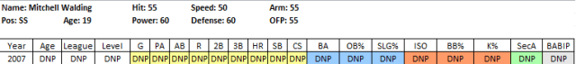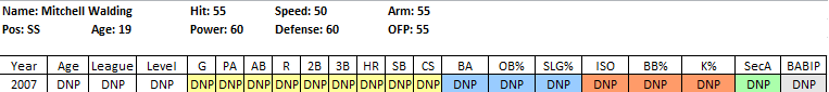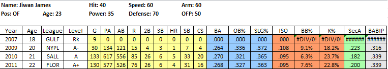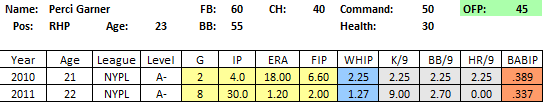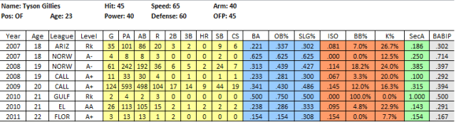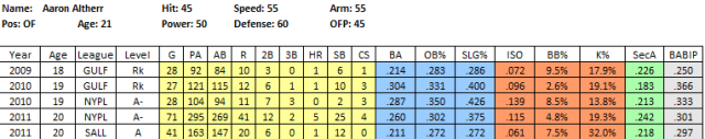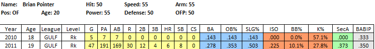 2011 In Review: After getting just 7 ABs last year, Pointer returned to the GCL and put up very good numbers, considering the brutal nature of the league for hitters, posting a .278/.353/.503 line in 191 PA. He did a bit of everything, posting an awesome .225 ISO, a 10% BB rate and was a perfect 8 for 8 in the stolen base department. He also chipped in 6 assists in just 47 games while playing all 3 outfield positions.
