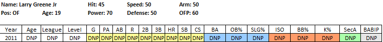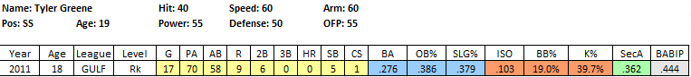 2011 In Review: Seen as a potential late first/early second round pick, Greene floated some big bonus demands and fell to the 11th round where the Phillies took a shot. It turns out they did their homework, as he signed for a very reasonable $375K. He signed a lot earlier than expected, which meant he was able to log some time in the GCL, where he more than held his own, hitting .276/.386/.379 in 70 PA.