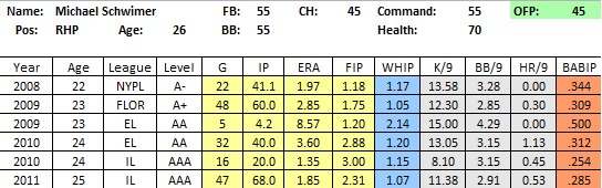 Raw Tools: Schwimer doesn’t light up the radar gun, with his fastball sitting in the 89-92 range, but he moves it around, cuts it, sinks it, and compliments it with a mid 80s slider that he will throw in any count. He’s worked hard on his changeup (which he’s detailed on this here site) and will have to continue to work on it to give him a weapon to at least keep lefties honest. He’s always had good control, walking right around 3 batters per 9 in 234 minor league innings, and he’s missed a ton of bats (12 per 9) at every stop. I give him a 55 grade for his fastball because what it lacks in velocity it makes up for in movement. Maybe its only a 50. Fine. I bump it up because he knows how to locate it and sequence it.