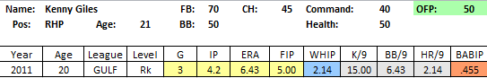 2011 In Review: Giles generated plenty of pre-draft buzz at Yavapai CC in Arizona, where he consistently touched the upper 90s with his fastball while flashing a plus breaking ball and a dash of wildness. I wouldn’t read anything in to his 3 pro appearances late in the season. You shouldn’t either. While he walked 22 in 38 innings at Yavapai, he also struck out 67. 67! Thats almost 16 strikeouts per 9 innings.