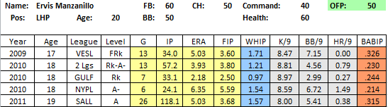 2011 In Review: In his full season debut, Wild Ervis turned in an all over the map season at Lakewood, striking out plenty of guys, walking plenty of guys, but not giving up a ton of hard contact and allowing just 5 HR all season.