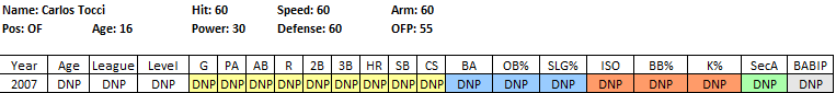 Misc Notes: Think back to what you looked like as a high school sophomore. Then imagine yourself playing pro baseball that summer. That is Carlos Tocci. Did you look differently as a high school senior? He probably will look different. Lets hope he is able to put on the pounds, in a good way. I could have gone groupthink and ranked him higher. But the risk here is astronomical. As it is with all 16 year old Latin American prospects. I’m willing to be 1 year behind the curve on him if he blows up in the GCL.