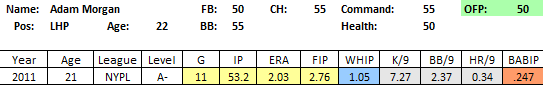 Misc Notes: I kind of feel like Morgan may be Matt Way 2.0. But maybe not, as his breaking ball seems more advanced. Then again, he was much tougher on RHB in his debut, a sign that maybe his changeup was the better pitch. Either way, he’s in the flier range here, and seems like if he remains healthy he should be some kind of big league contributor. But I want to see what his fastball looks like in 2012 before knowing what to make of him.