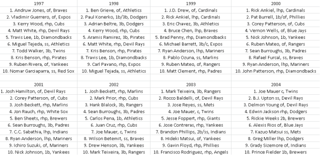 I want to start off by presenting a chart. One of the many visual aids you will find in this piece. This chart is a snapshot of the Top 10 prospects in baseball according to Baseball America from 1997-2004. As with this and all future images, if its too small to read, click on it or open it in a new tab.
